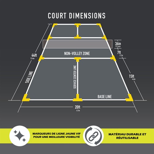 Conforme aux exigences de la fédération USA Pickleball pour les compétitions extérieures, ce kit est également conçu pour durer : son matériau résistant et lavable permet une utilisation récurrente sans déformation ni glissement.