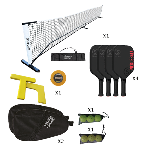- Kit complet (Un filet + 1 set de marquage + 4 raquettes bois + 1 lots de 3 balles intérieures + 1 lot de 3 balles extérieures + 2 sacs )